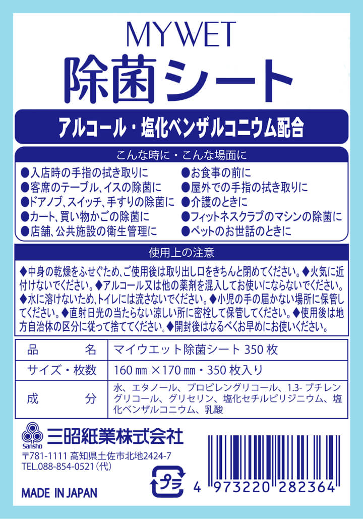 製 造 元三昭紙業株式会社 品 名マイウエット除菌シート 350枚(詰替用) 寸 法160×170mm(シートサイズ) 枚 数350枚 成 分水、エタノール、プロピレングリコール、1.3-ブチレングリコール、グリセリン、塩化セチルピリジウム、塩化ベンザルコニウム、乳酸 JANコード4973220282364 区 分ウエットティシュ 生 産 国日本製