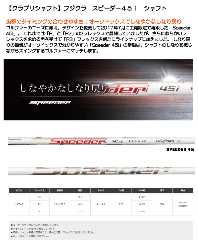 〒522−0006 滋賀県彦根市佐和山町150−1 つるやゴルフ彦根工場 ゴルフ工房 宛て 0120−268−562■モデル SPEEDER 45i フレックス R3 / R2 / R 製品長 35.5〜40.0 重量 45(R3) / 46(R2) / 47(R) トルク 4.0〜4.2 Tip径 9.35 Butt径 14.9(R3) / 14.95(R2/R) 調子 先中調子
