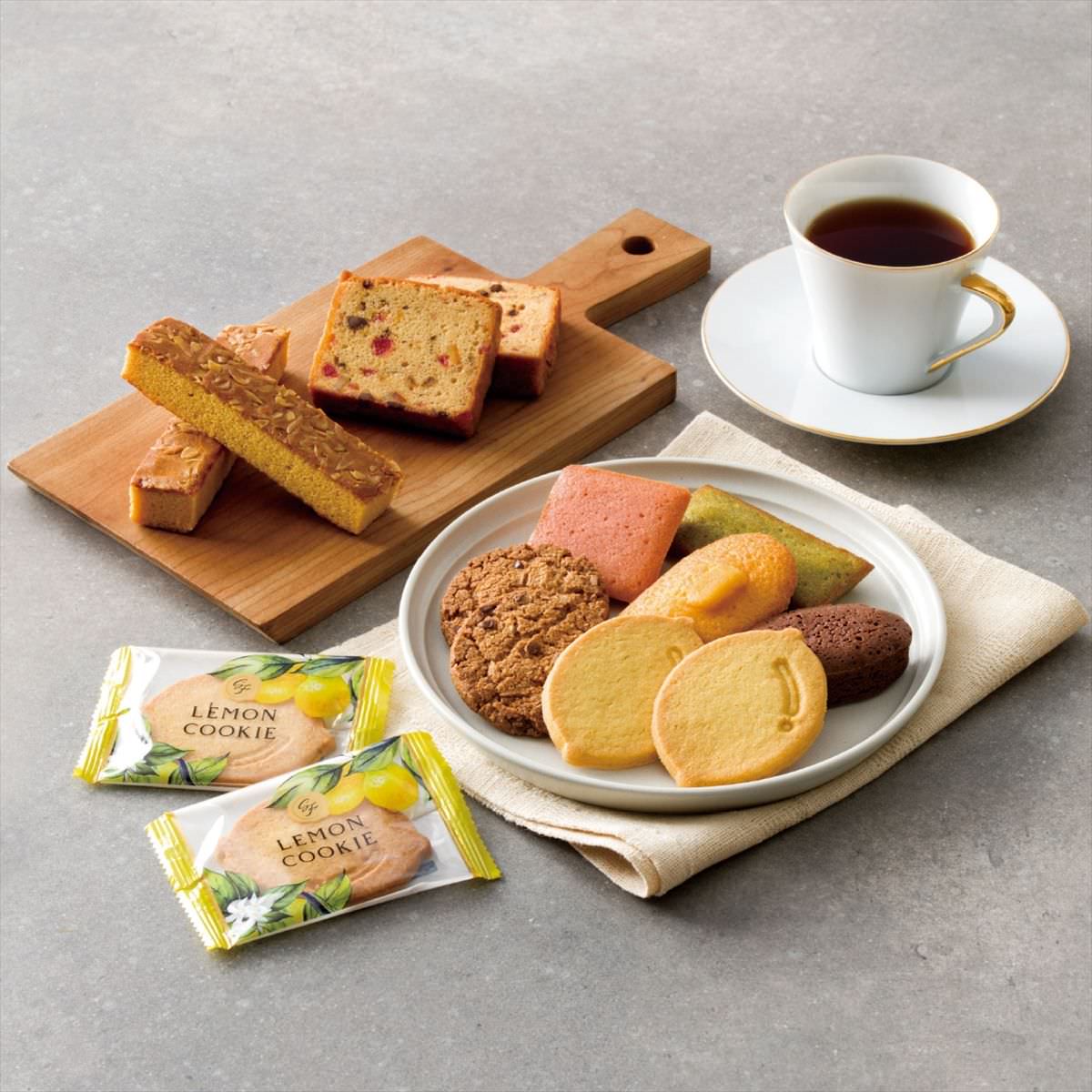 【数量・内容】オレンジマドレーヌ・ピスタチオフィナンシェ各3個・ブラウニー4個・ブラウンシュガーパウンドケーキ2個・ケーキ(ストロベリーショコラ4個・アーモンドキャラメル2個)・クッキー(チョコチップ・レモン各5個)【賞味期間】製造日より常温約120日【仕様】こちらの商品は沖縄・離島へのお届けができません。