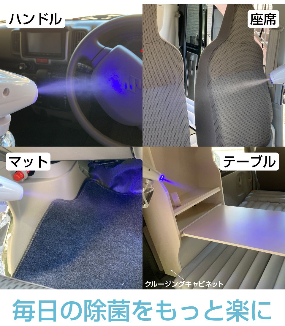 ・日々車で通勤・通学をする方や、タクシー・バス・トラック・救急車・消防車等の共用車の日々の除菌に便利! ・シートやボトルでの除菌は手間も時間もかかりますが、ガンタイプなので楽々除菌ができて時短ができます。