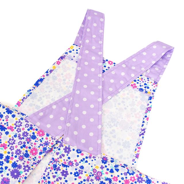 商品名バッククロス子どもエプロン(100〜120cm) フラワー模様のエアリーシャワー(ラベンダー)商品の特長1.ひとりで簡単に着脱できるバッククロスタイプ肩紐が背中で交差しているので肩からずり落ちにくく、紐がうまく結べない小さな子どもでも、着脱簡単。