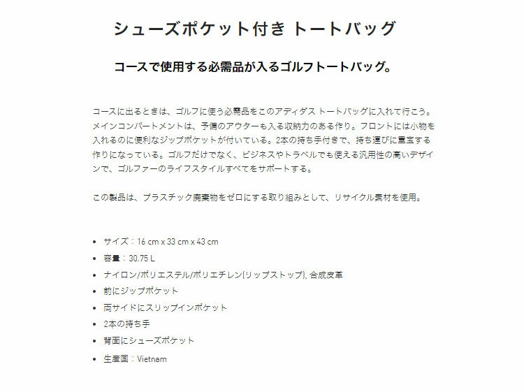 アディダス ゴルフ GO-TO EMH77 シューズポケット付き トートバッグ [30L]