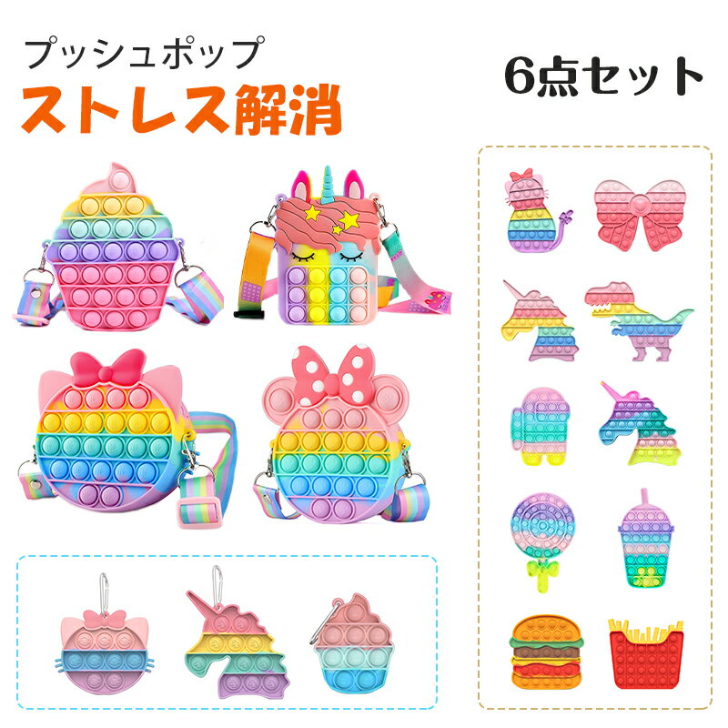 プッシュポップ 6点セット バッグ ショルダーバッグ キーホルダー ストレス解消グッズ 無限プチプチ スクイーズ玩具 知育 人気 ポップイット ユニコーン 猫 収納 大容量 ポッププッシュ プッシュポップスクイーズ 減圧おもちゃ ぷっしゅぽっぷバブル 子供 宅配便 送料無料