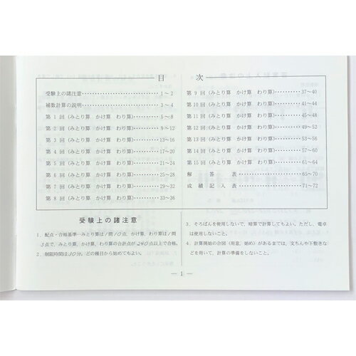 出題内容 ◆みとり算:7けた 10口 10問 ◆かけ算:実・法合わせて8けた 20問 ◆わり算:法商合わせて7けた 20問 巻頭/導入問題・説明等なし。